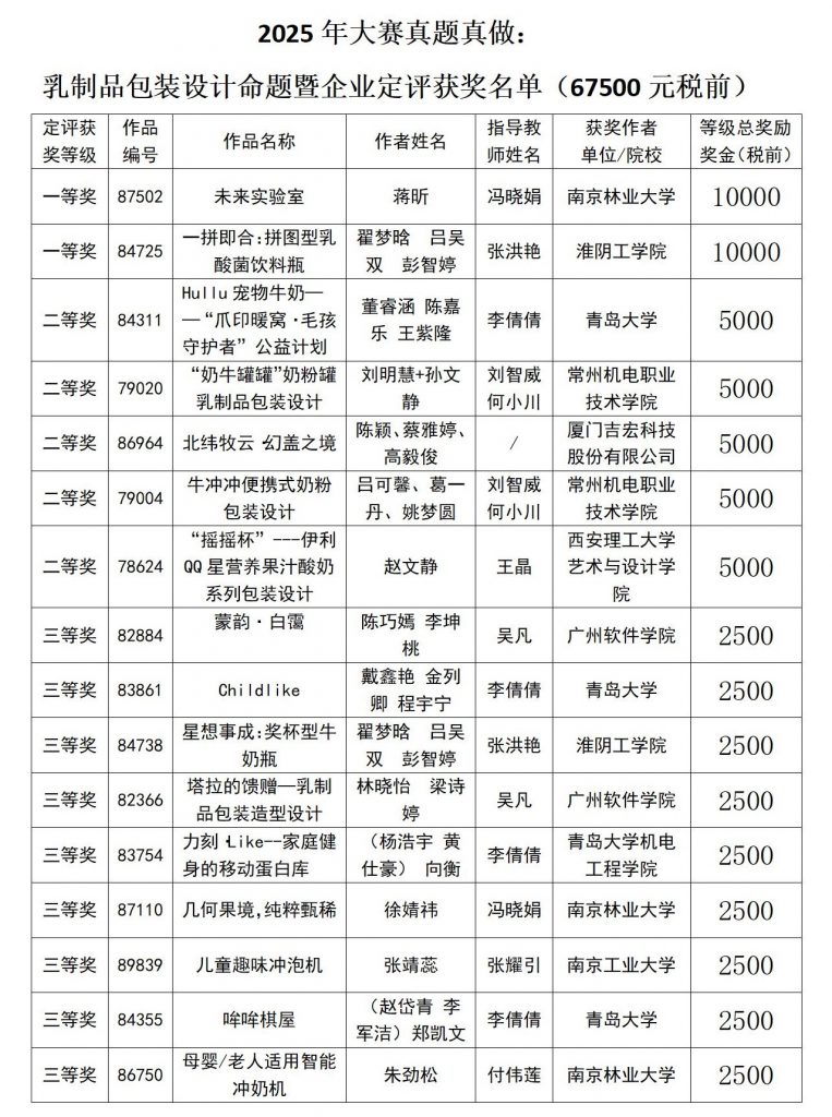 命题设计的奖励奖金发放是以企业定评结果名单(以此公布的获奖名单)为颁发依据,并按照国家税务制度扣除相关所得税后颁发到个人。其中本届伊利乳制品包装设计命题企业委托组委会代为颁发本次命题的奖励奖金。目前组委会正在根据命题企业提供的企业定评结果名单,核实相关信息进行报税和发放相关奖励奖金,请定评结果名单的作者和老师积极配合。